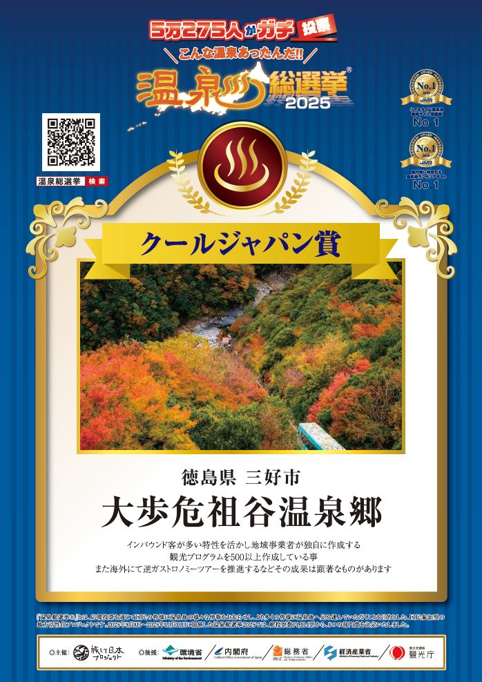 このたび大歩危祖谷温泉郷は、「温泉総選挙2025」受賞式において、特別賞である クールジャパン賞 を受賞いたしました。